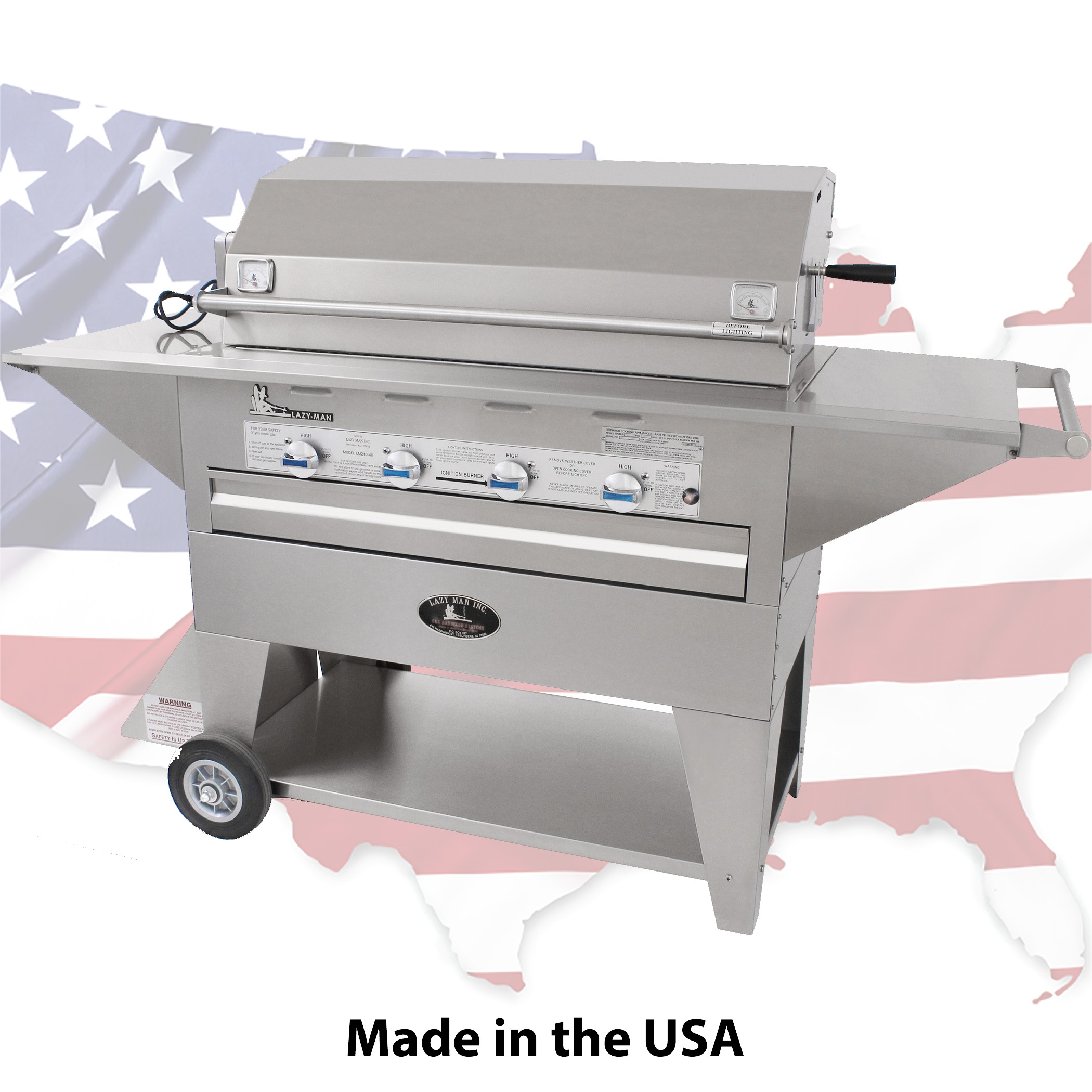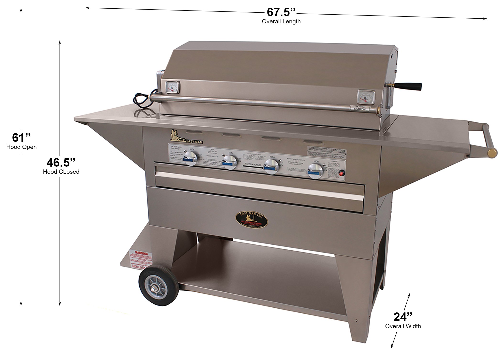 210-40 Lava Rock Mobile Gas Grill with Stainless Steel Grates, Hood, and Hood Mounted Rotisserie