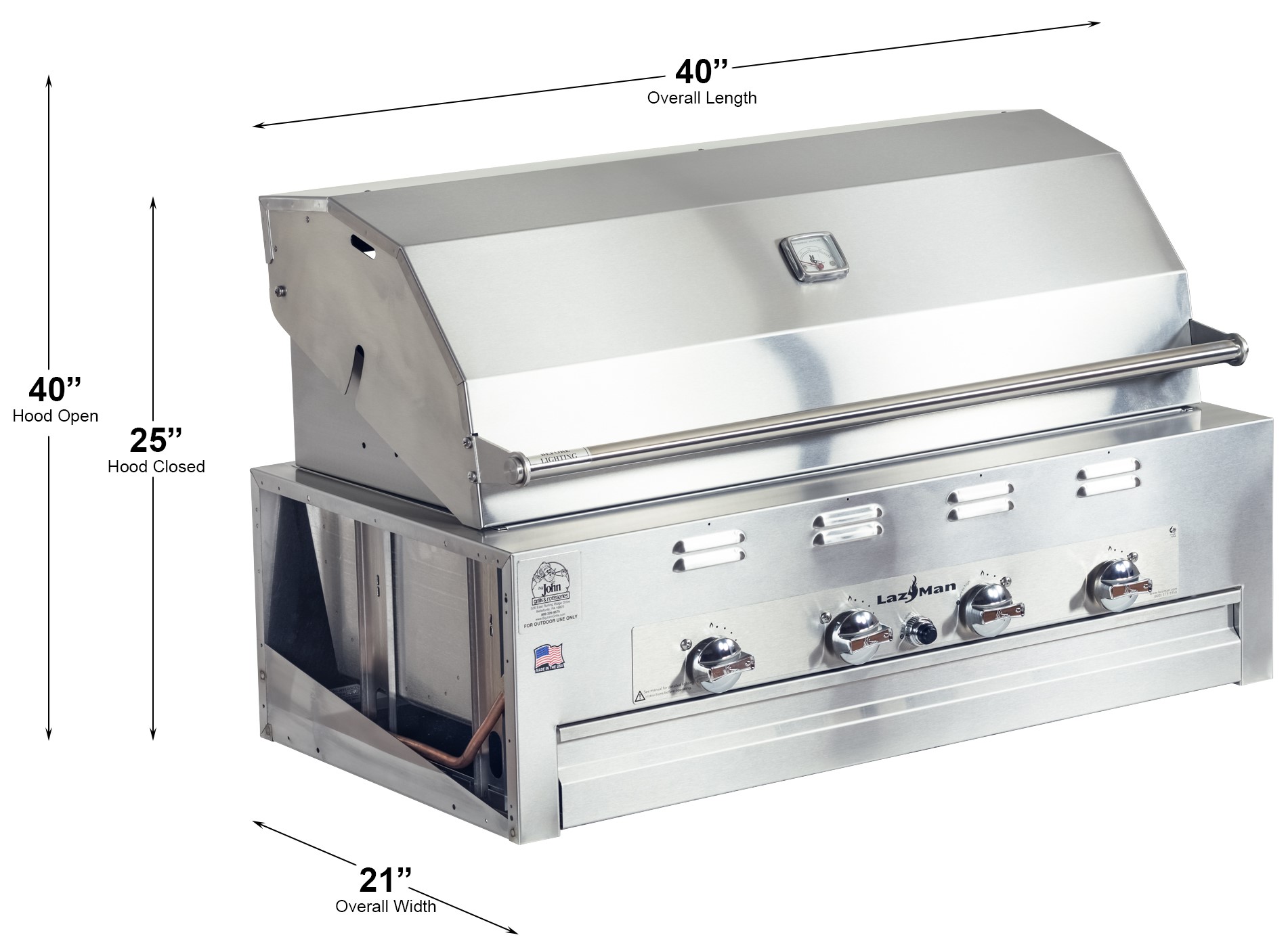 Four independently controlled 12,000 BTU burners, unique firebox design to prevent flare-ups and convenient electronic ignition are coupled with lava rock to produce commercial results in a grill built for residential use.