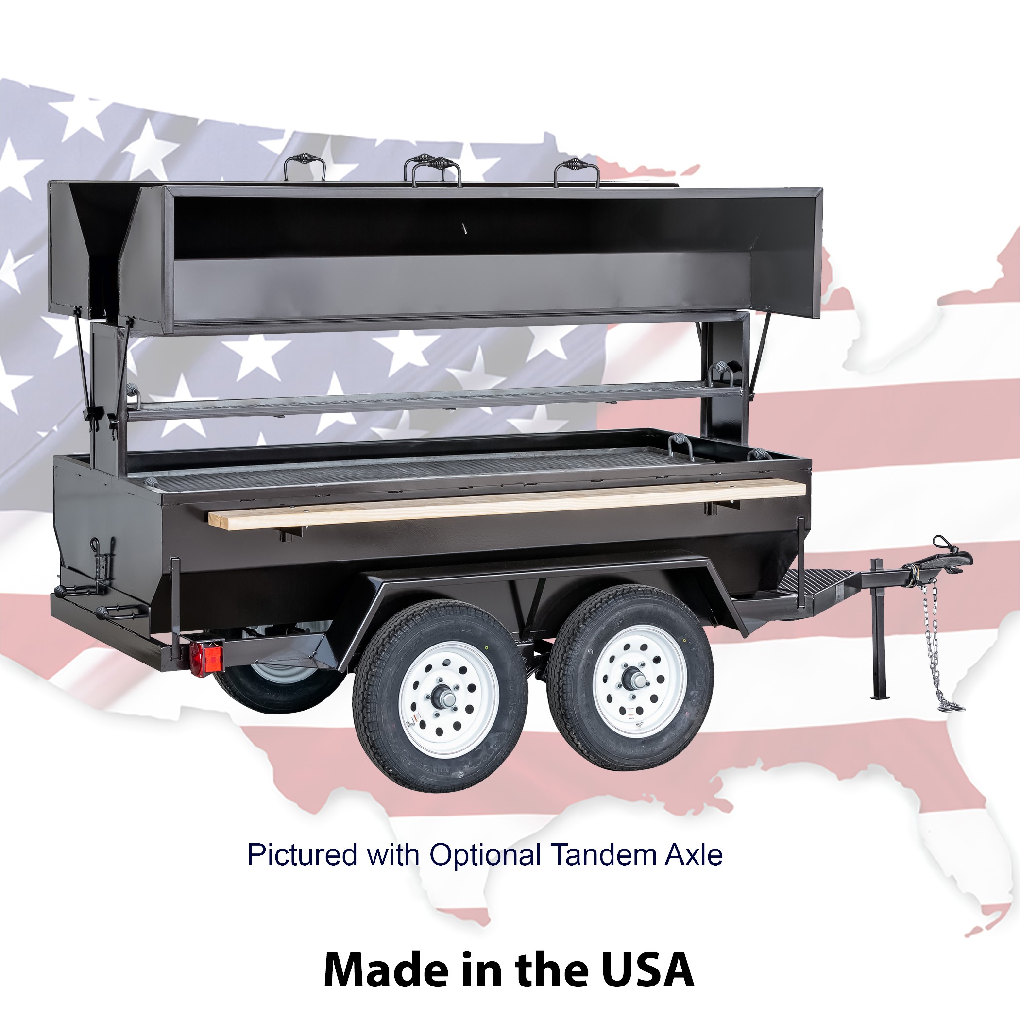 8DDG Tow Behind Charcoal Grill with Single Axle, Wheel & Tire Upgrade, 2 Wood Cutting Boards, Steel Warming Rack, 2 Thermometers, & Ash Pan