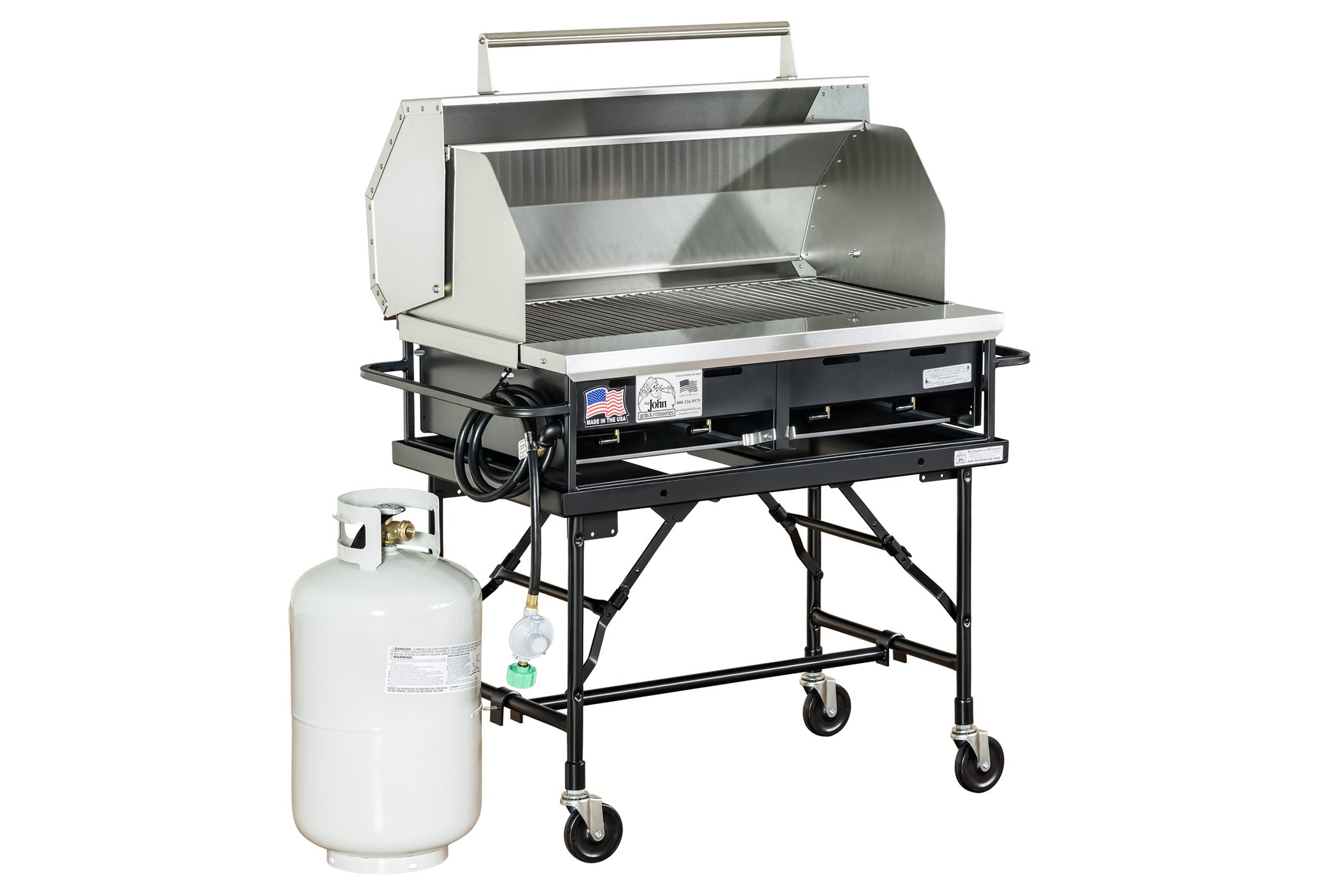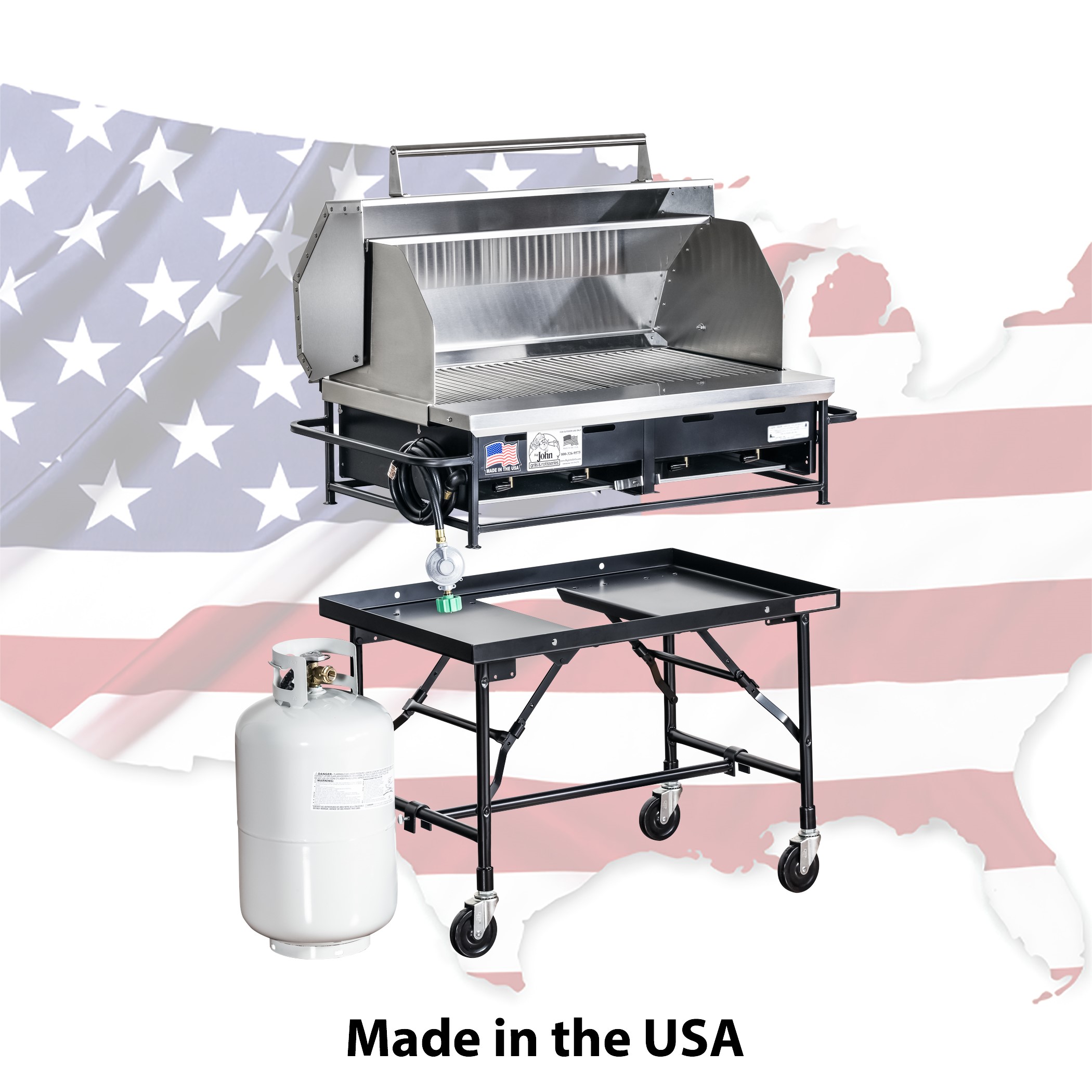 A2P Table Top Gas Grill with Stainless Steel Grates, Hood, Folding Leg Cart, Leg Brace, and Tank