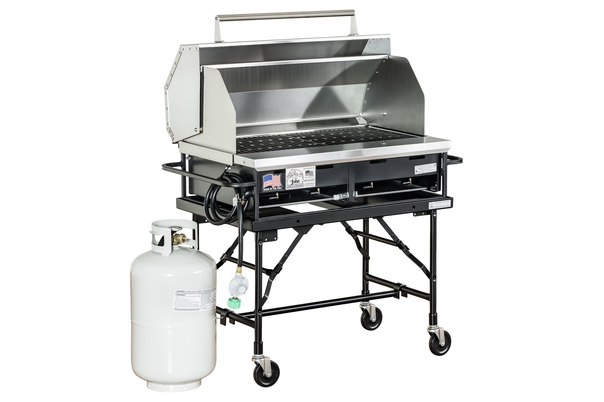A2P Table Top Gas Grill with Cast Iron Grates, Hood, Folding Leg Cart, Leg Brace, and Tank