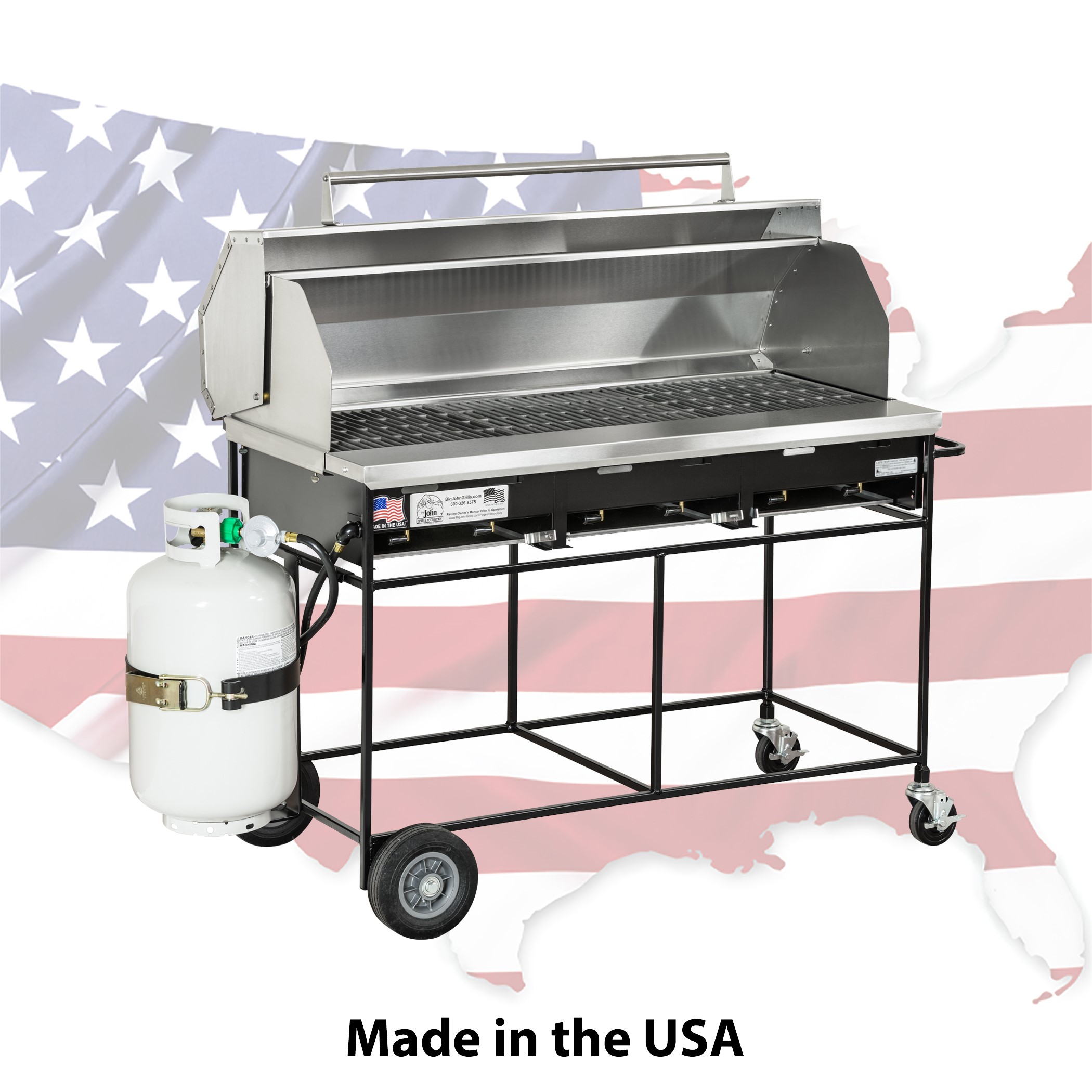 Our 56 inch, 6 burner, 120,000 BTU commercial grill has a large enough cooking capacity to feed any crowd, while still small enough to fit into most mini vans, large SUV’s, and short-bed trucks.