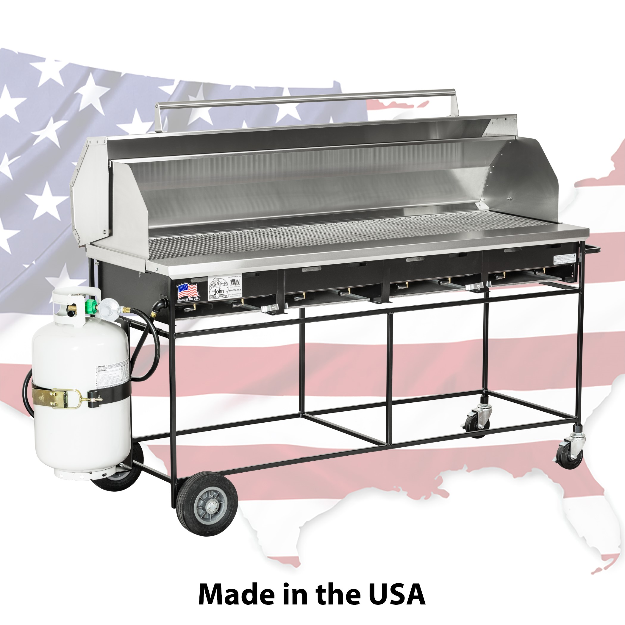The A4 Country Club is the preferred choice of Big John customers for the last 34 years. The 65" x 16.25" cooking surface is separated into 4 separate sections. Paired here with the stainless steel roll-top hood for excellent versatility.