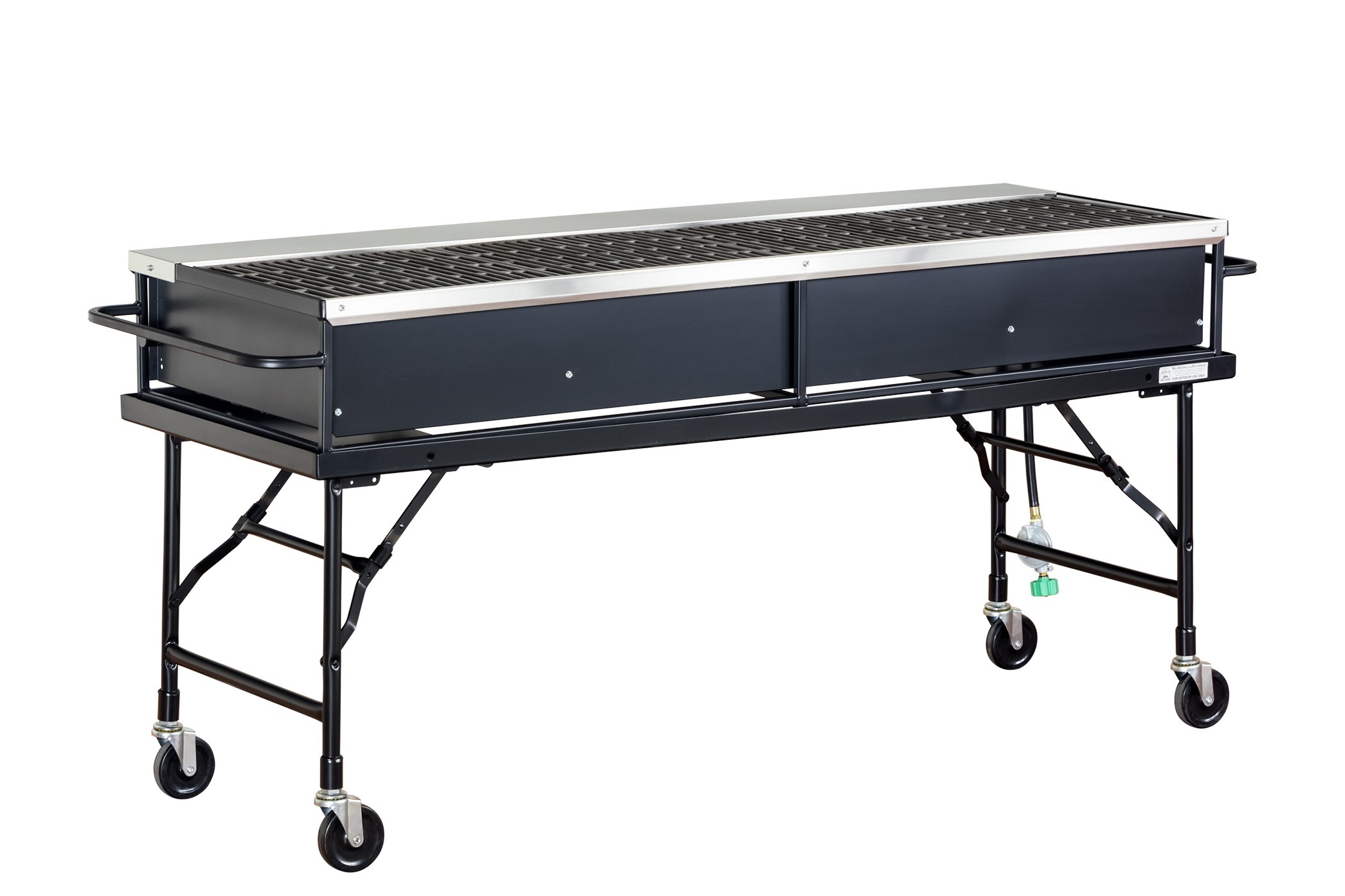 Compact by design for easy transportation and stackable storage. Ideal for anyone needing a space saving commercial barbeque grill. Choose to add a separate folding leg cart and leg brace.