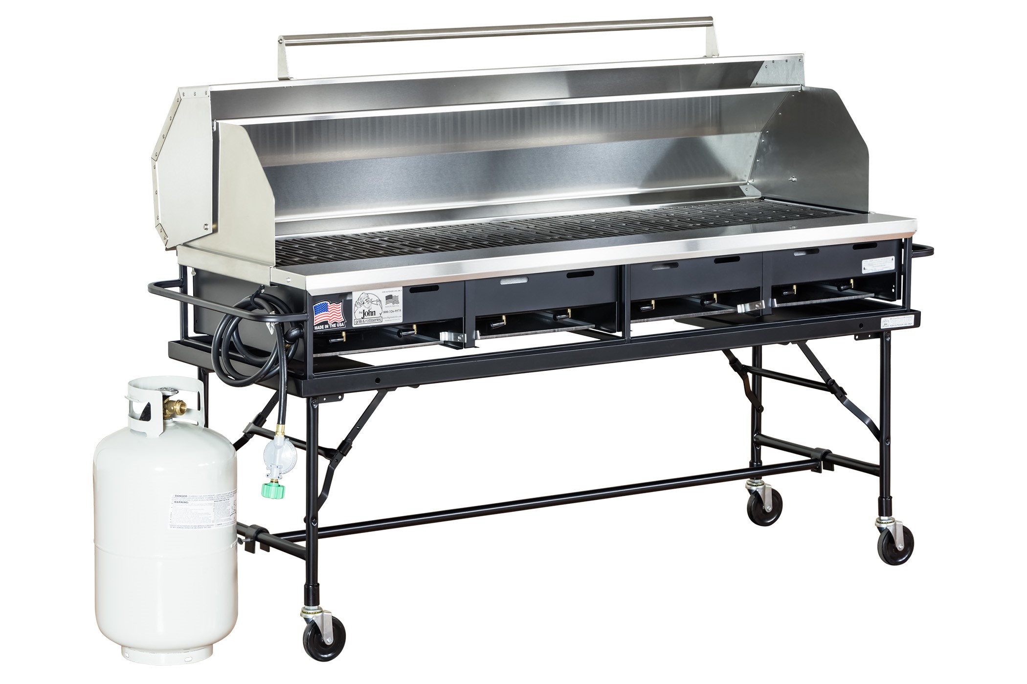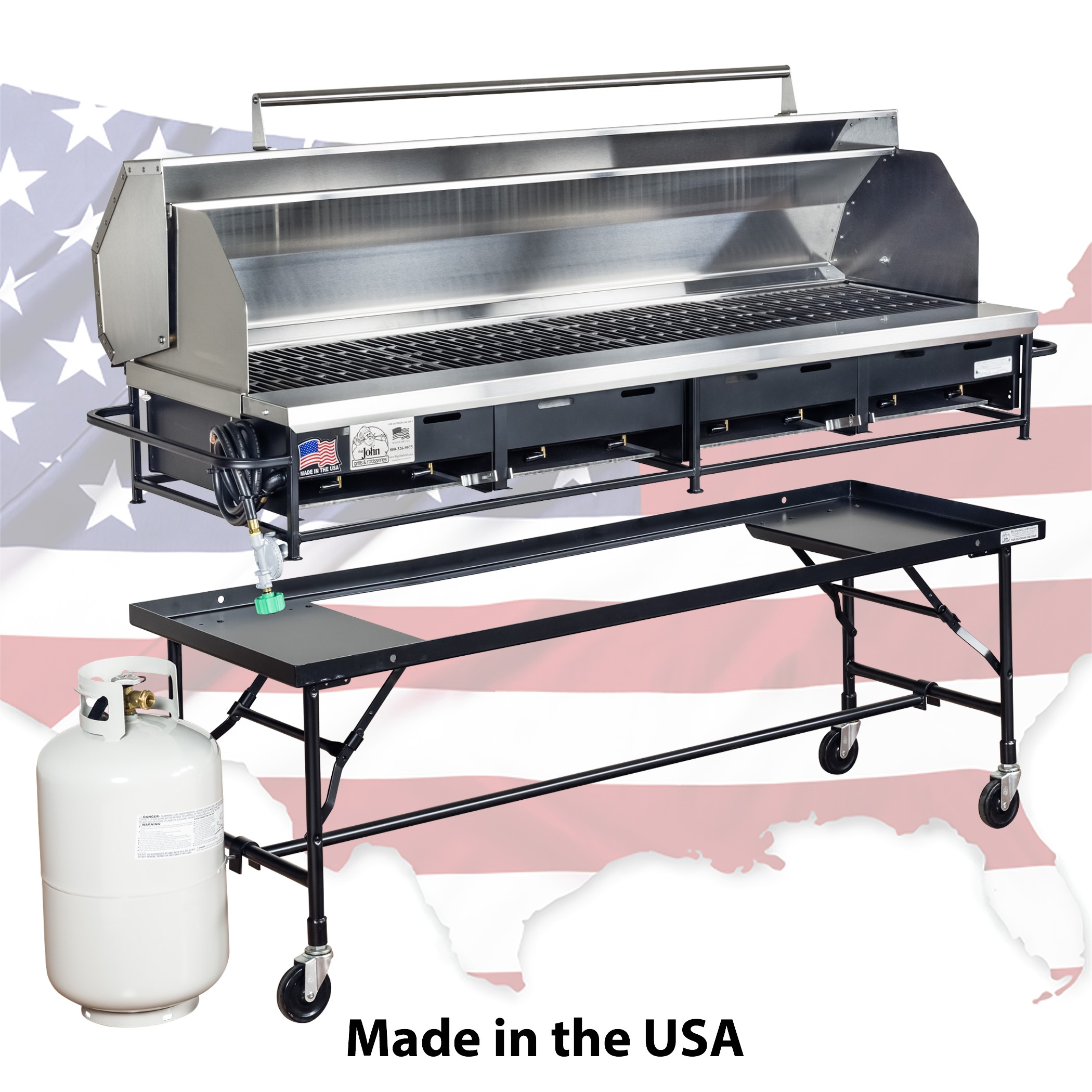 A4P Table Top Gas Grill with Cast Iron Grates, Hood, Folding Leg Cart, Leg Brace, and Tank