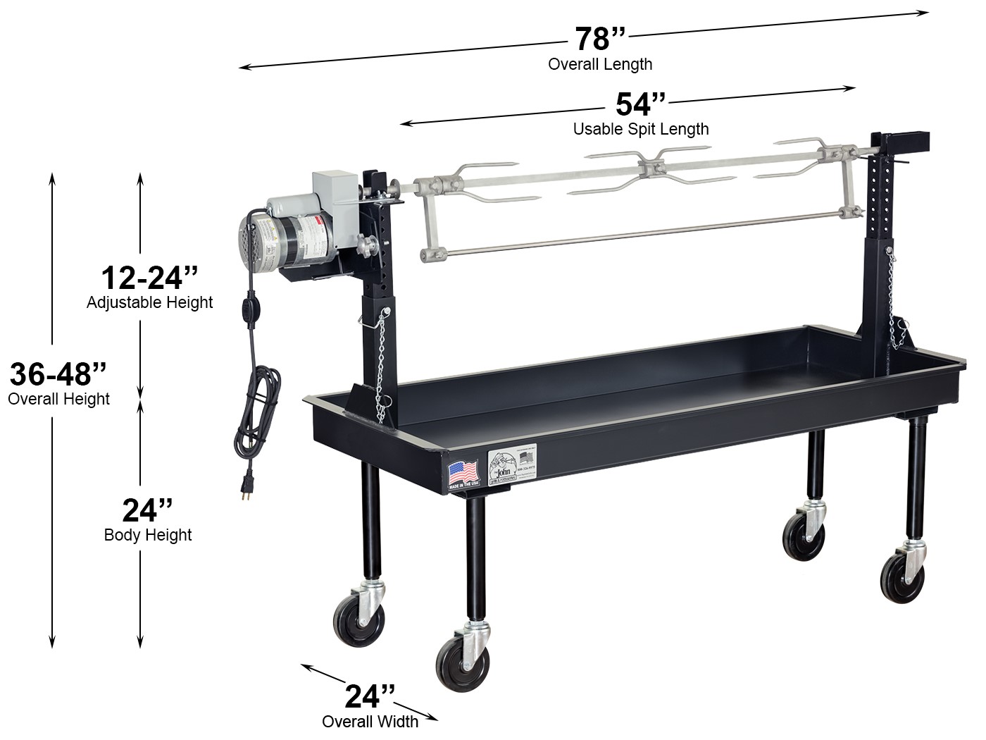 A 5’ rotisserie spit with a capacity of 125 lbs. can feed a crowd quickly and efficiently while maintaining the authentic smoky barbeque flavor we all love.