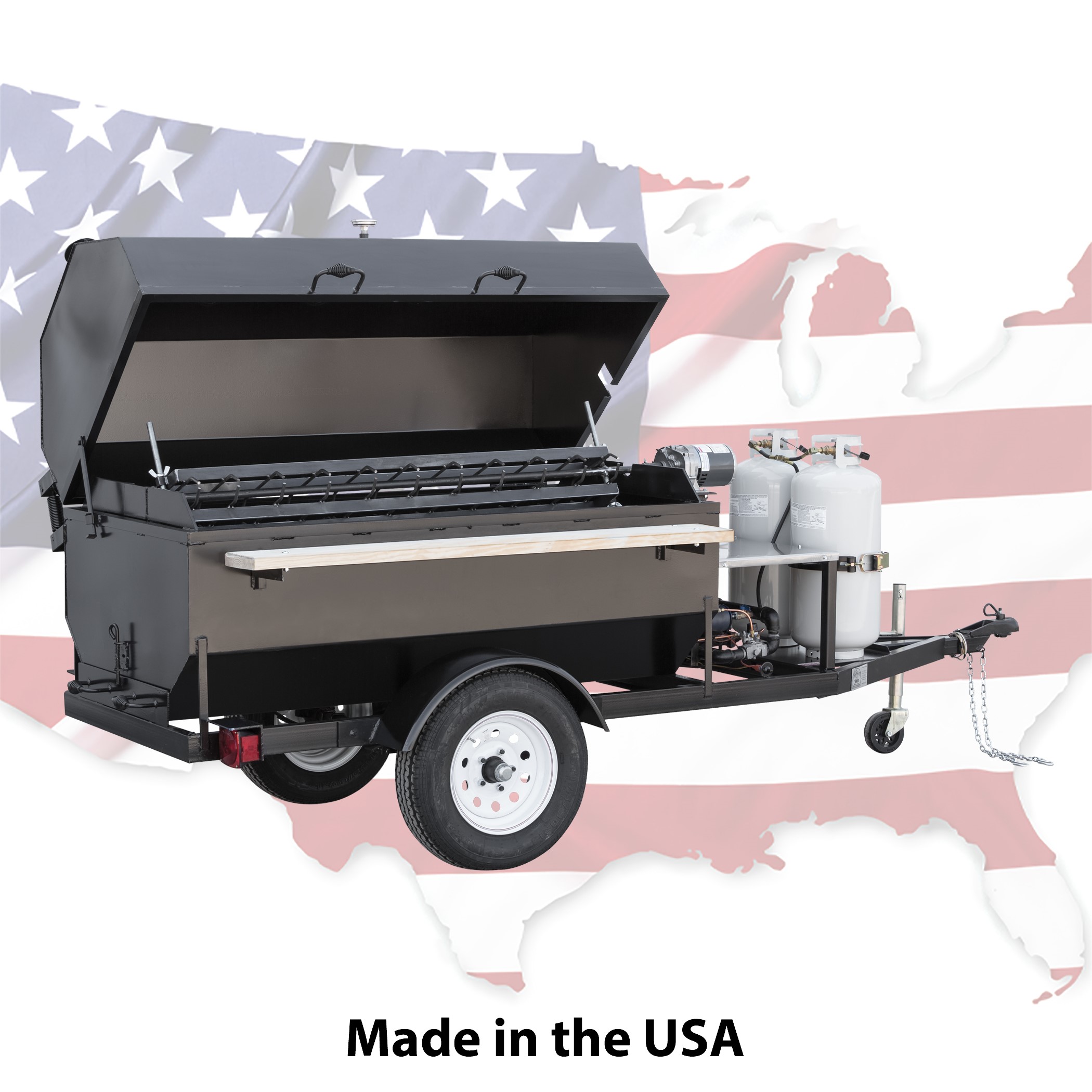RW6SDR Tow Behind Gas Rotisserie with Expanded Steel Grate, 2 - 40 lb. Propane Tanks, Wood Cutting Board, Thermometer, 13" Wheel & Tire Upgrade, & Steel Cage-Style Rotisserie