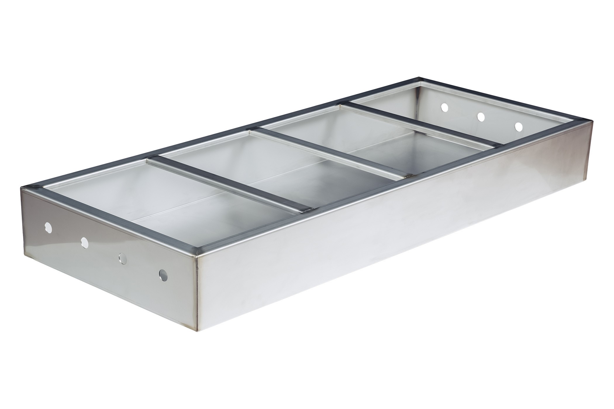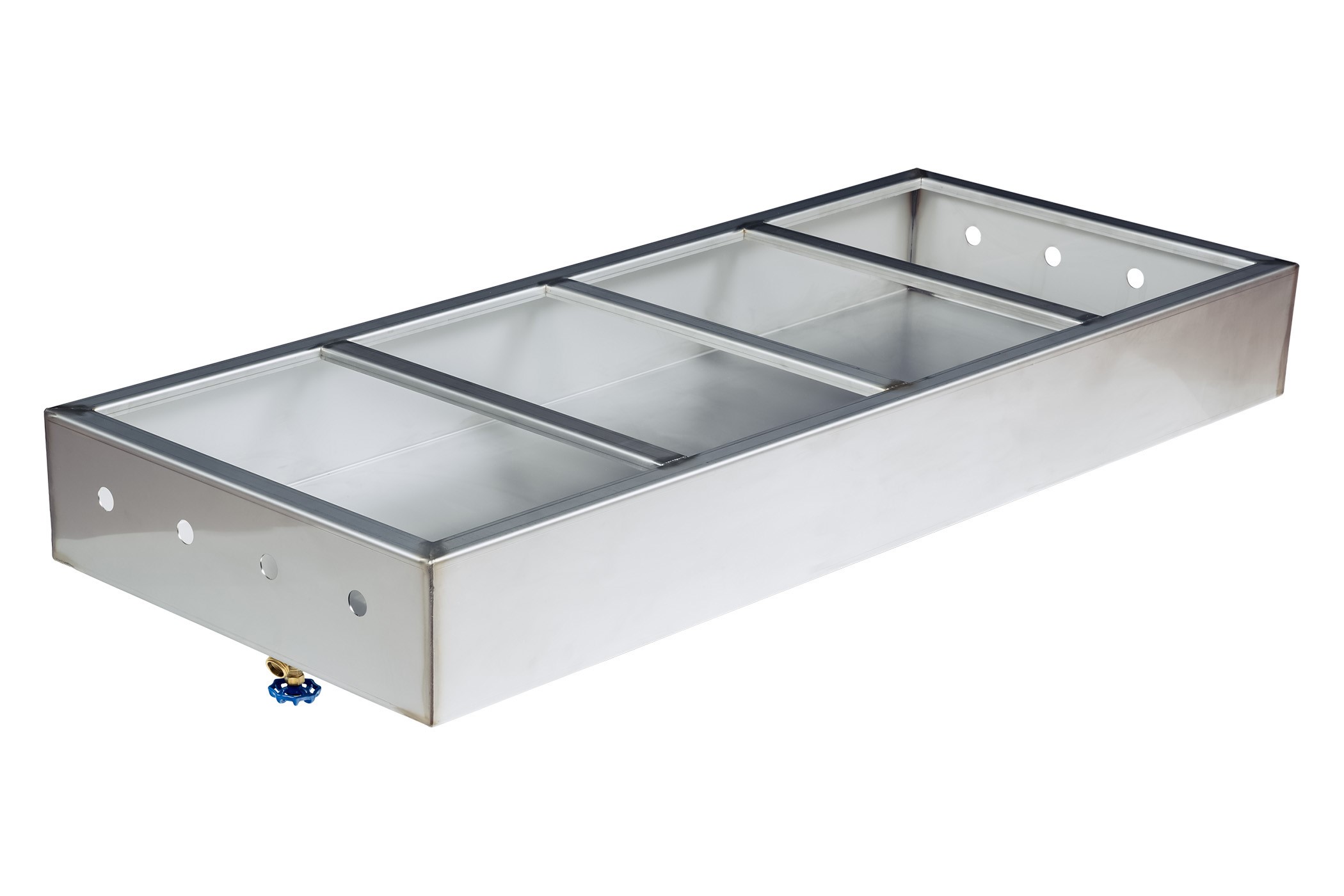 This one-piece 304 stainless steel, 4 bay water pan is easy to clean and accepts standard size chafing dishes, pans, and lids. The carbon steel base and legs are powder coated to better protect the body during use and transportation.