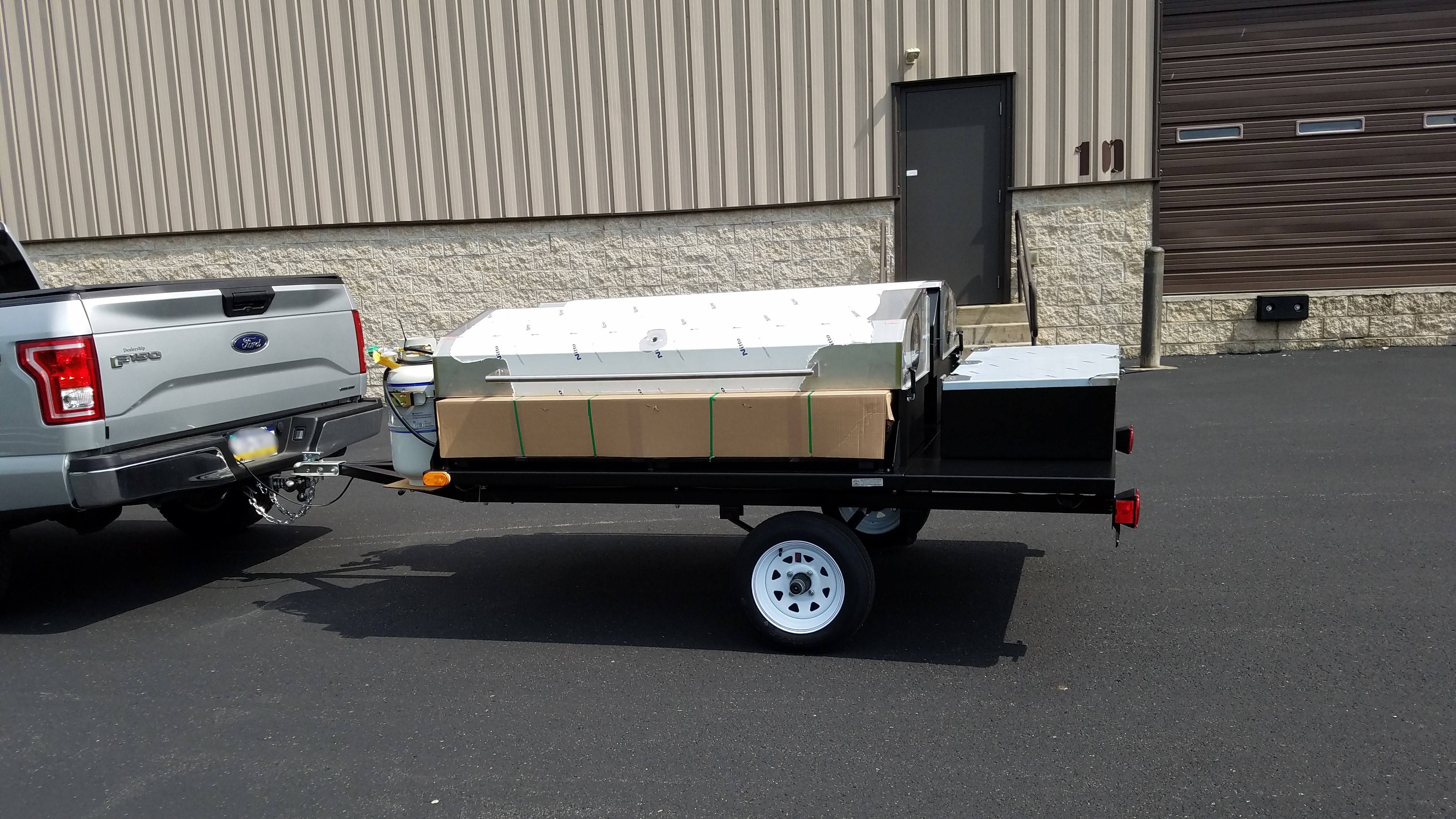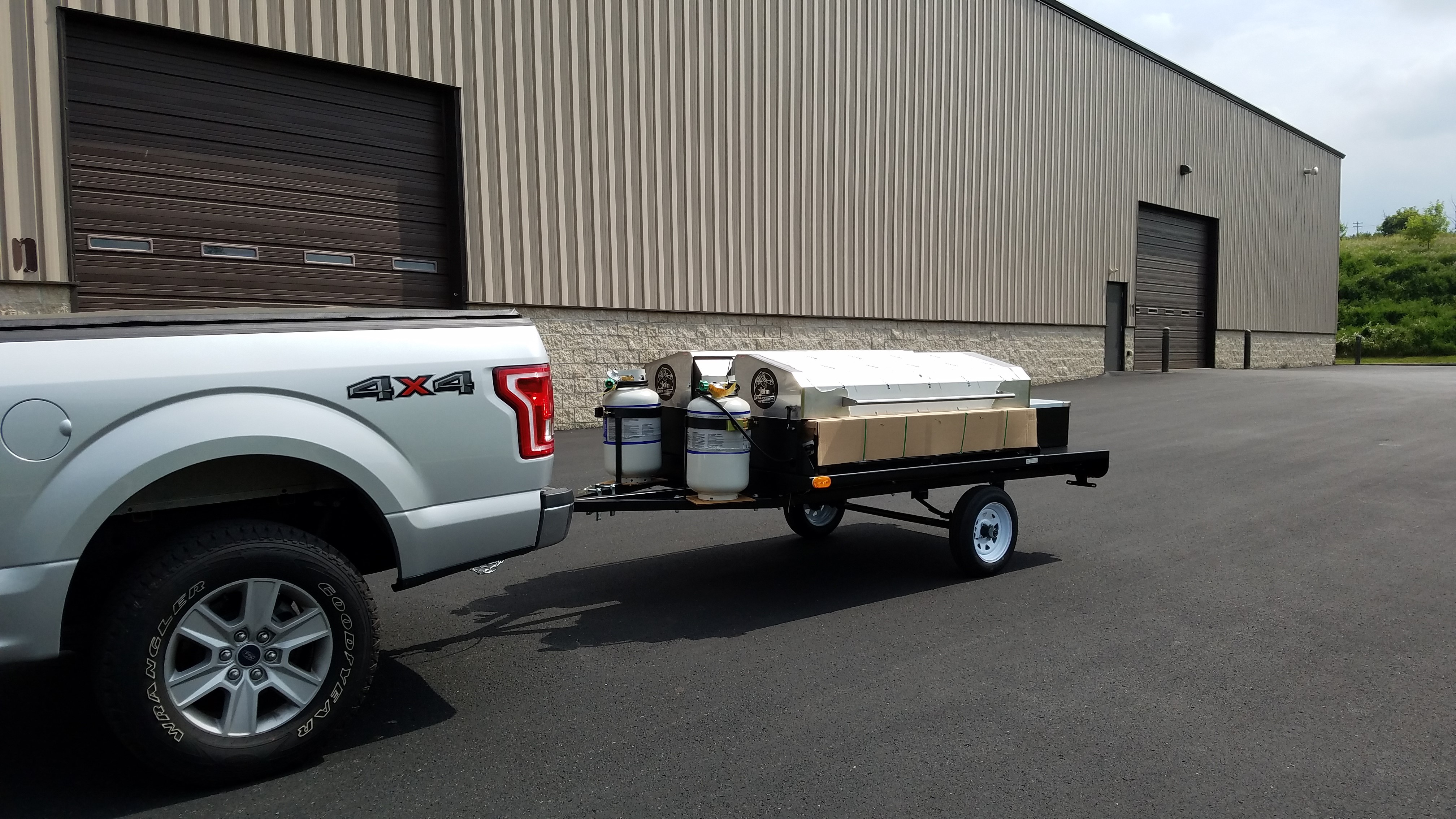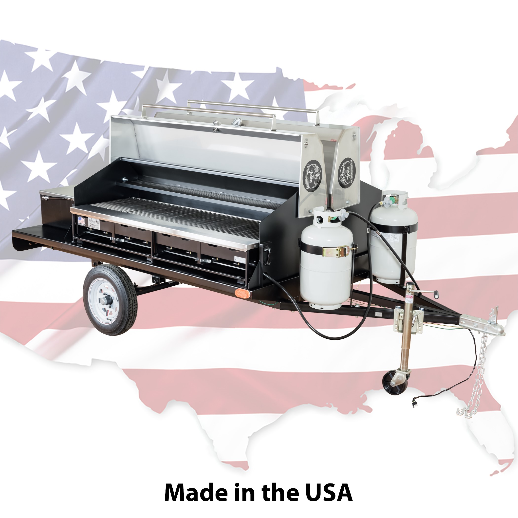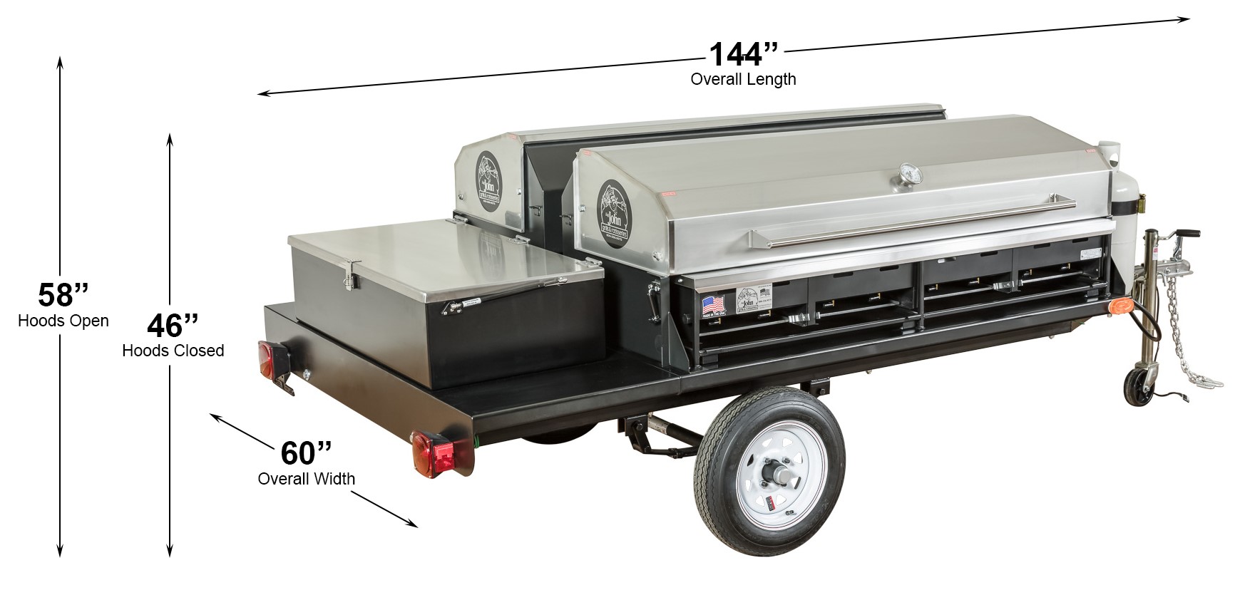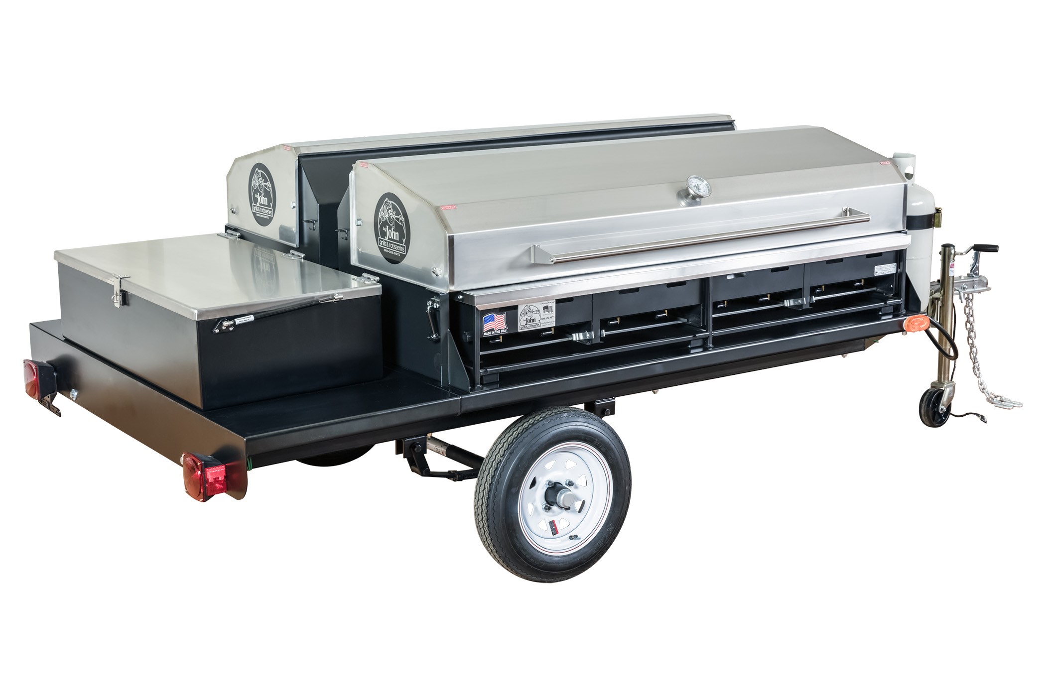 This tow-behind grill features two of our A4P liquid propane (LP) commercial grills, for a total of 16 burners and 320,000 BTUs with warming racks. It is still the work horse with twice the cooking area of the Trail Boss I.